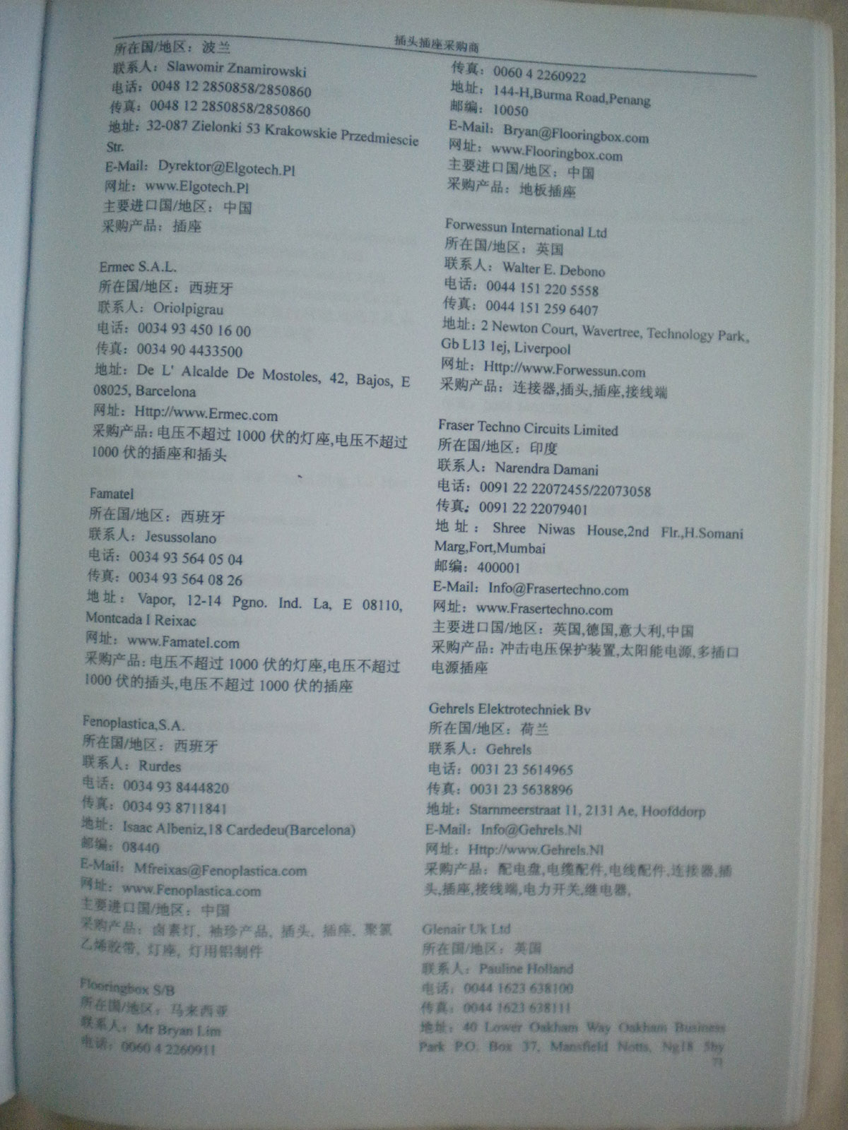 書刊簡介:《全球采商黃頁》系列叢書是由全球最活躍的專業(yè)買家及重要國際性展會的到會采購商名片信息匯編而成,包含三十多個行業(yè)分類,匯集了各類產(chǎn)品的買家信息。其中收錄的每家采購商信息均是我們通過與買家面對面的登記整理收集而成,采購意向明確,針對性強。為了確保信息的準確性和時效性,我們定期進行跟進、回訪、補充及更新工作。每家采購商信息包括國別、公司名稱、聯(lián)系人、地址、電話、傳真、電郵、網(wǎng)址、采購產(chǎn)品等詳細內(nèi)容,每冊《黃頁》約有兩千家左右的采購商信息。在當前國際出口形勢日趨嚴峻的環(huán)境下,如何降低成本開拓國際市場,是每個出口企業(yè)急需尋找的答案,我們相信通過我們10多年的外貿(mào)信息服務經(jīng)驗和最新的國際買家資源服務,將會為您拓展全球市場提供最直接有效的幫助。專業(yè)對口的買家信息一定會幫助貴公司打開更廣闊的外貿(mào)市場!