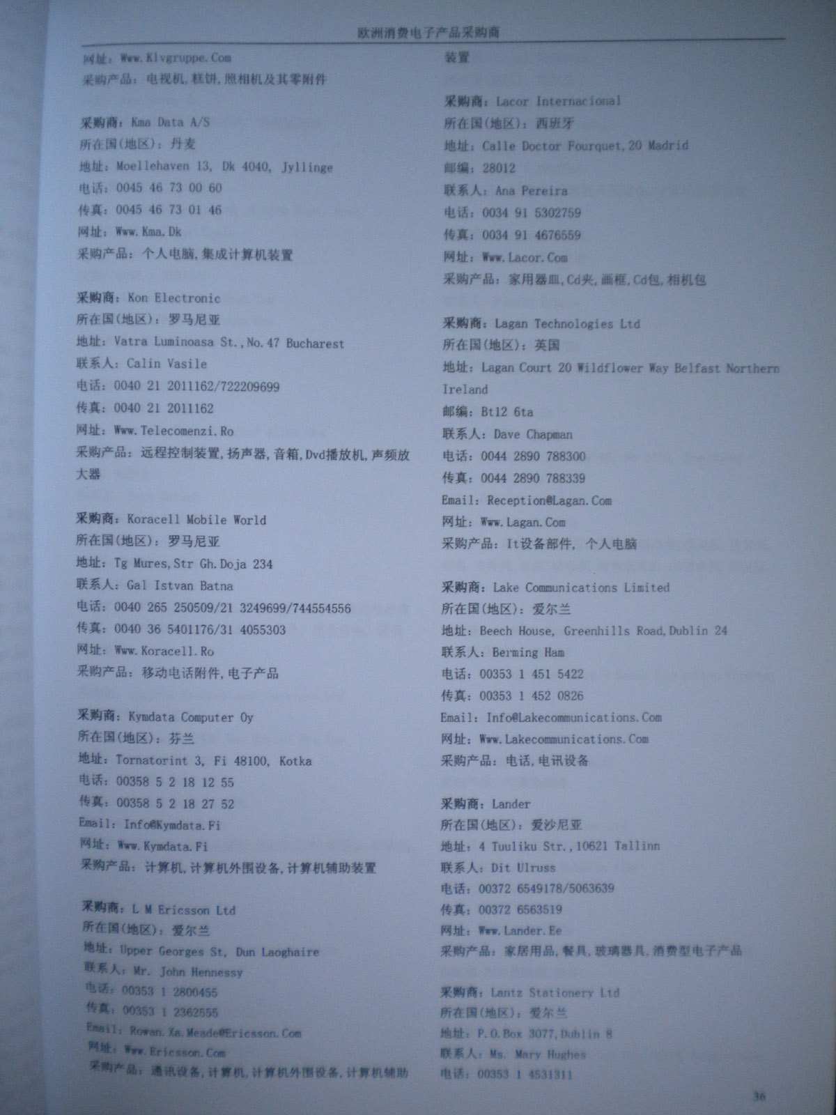 書刊簡介:《全球采商黃頁》系列叢書是由全球最活躍的專業(yè)買家及重要國際性展會的到會采購商名片信息匯編而成,包含三十多個行業(yè)分類,匯集了各類產(chǎn)品的買家信息。其中收錄的每家采購商信息均是我們通過與買家面對面的登記整理收集而成,采購意向明確,針對性強(qiáng)。為了確保信息的準(zhǔn)確性和時效性,我們定期進(jìn)行跟進(jìn)、回訪、補(bǔ)充及更新工作。每家采購商信息包括國別、公司名稱、聯(lián)系人、地址、電話、傳真、電郵、網(wǎng)址、采購產(chǎn)品等詳細(xì)內(nèi)容,每冊《黃頁》約有兩千家左右的采購商信息。在當(dāng)前國際出口形勢日趨嚴(yán)峻的環(huán)境下,如何降低成本開拓國際市場,是每個出口企業(yè)急需尋找的答案,我們相信通過我們10多年的外貿(mào)信息服務(wù)經(jīng)驗(yàn)和最新的國際買家資源服務(wù),將會為您拓展全球市場提供最直接有效的幫助。專業(yè)對口的買家信息一定會幫助貴公司打開更廣闊的外貿(mào)市場!