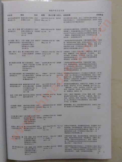 最新福建外資企業(yè)黃頁涵蓋了福建外商獨(dú)資企業(yè)、中外合資經(jīng)營企業(yè)以及港、澳、臺資企業(yè),包括福建日資臺資企業(yè)黃頁,福建外企黃頁具體內(nèi)容包括:企業(yè)名稱、地址、電話、傳真、郵箱、經(jīng)營范圍、注冊資金等信息;福建外資企業(yè)名單里面的企業(yè)都一些中外合資的大企業(yè),這些公司經(jīng)濟(jì)實力都比較雄厚,出口產(chǎn)品也比較多,業(yè)務(wù)范圍都比較廣,跟他們開展業(yè)務(wù)往來都比較容易;有了福建日企臺企黃頁開展業(yè)務(wù)也有了針對性,也省去了盲目去尋找客戶名單而浪費(fèi)的時間了,工作效率也會有很大的提高.歡迎需要的客戶及時聯(lián)系我們!