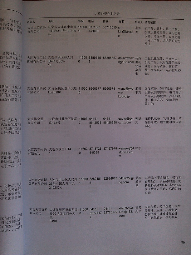 最新大連外資企業(yè)黃頁涵蓋了大連外商獨(dú)資企業(yè)、中外合資經(jīng)營企業(yè)以及港、澳、臺(tái)資企業(yè),包括大連臺(tái)資日資企業(yè)黃頁,大連外企黃頁具體內(nèi)容包括:企業(yè)名稱、地址、電話、傳真、郵箱、經(jīng)營范圍、注冊(cè)資金等信息;大連外資企業(yè)名單里面的企業(yè)都一些中外合資的大企業(yè),這些公司經(jīng)濟(jì)實(shí)力都比較雄厚,出口產(chǎn)品也比較多,業(yè)務(wù)范圍都比較廣,跟他們開展業(yè)務(wù)往來都比較容易;有了大連臺(tái)企日企黃頁開展業(yè)務(wù)也有了針對(duì)性,也省去了盲目去尋找客戶名單而浪費(fèi)的時(shí)間了,工作效率也會(huì)有很大的提高.歡迎需要的客戶及時(shí)聯(lián)系我們!