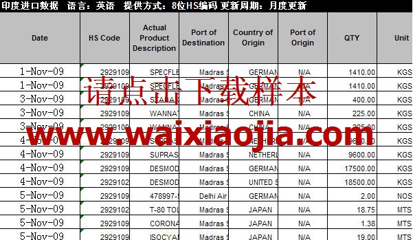 印度進(jìn)口海關(guān)數(shù)據(jù)主要產(chǎn)品內(nèi)容包括: 進(jìn)口商公司名稱、進(jìn)口單價(jià)、進(jìn)口總價(jià)、 H.S 編碼、產(chǎn)品描述、進(jìn)口日期、進(jìn)口數(shù)量、數(shù)量單位、原產(chǎn)國(guó)、運(yùn)輸方式。