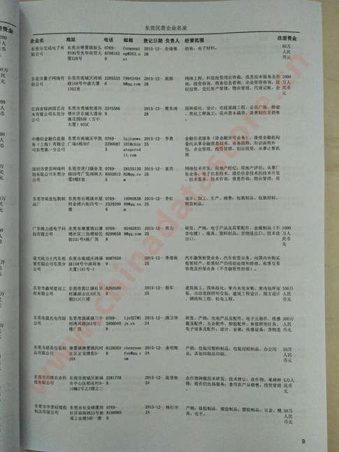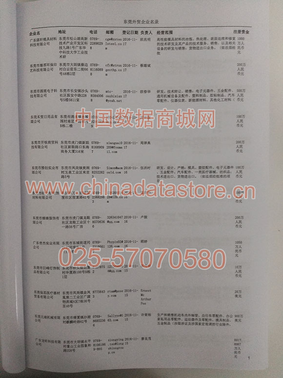 2021版最新東莞企業(yè)黃頁包括《東莞制造企業(yè)黃頁》、《東莞貿(mào)易企業(yè)黃頁》、《東莞民營企業(yè)黃頁》、《東莞外資企業(yè)黃頁》、《東莞外貿(mào)企業(yè)黃頁》共五冊,現(xiàn)優(yōu)惠價(jià):280元/冊。每冊內(nèi)容包括:單位名稱、地址、郵編、電話、傳真、郵箱、經(jīng)營范圍等;東莞企業(yè)黃頁涵蓋了近幾年來最新成立的、有一定規(guī)模的企業(yè),具有非常高的營銷價(jià)值。有了這套黃頁開展業(yè)務(wù)也有了針對性,也省去了盲目去尋找客戶名單而浪費(fèi)的時(shí)間了,工作效率也會有很大的提高。歡迎需要東莞企業(yè)黃頁的朋友及時(shí)聯(lián)系我們!