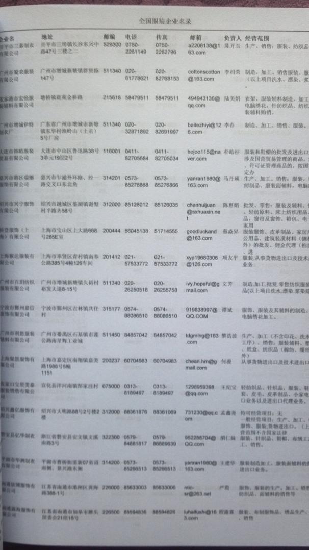 服裝外貿(mào)企業(yè)黃頁包括:外貿(mào)企業(yè)名稱、地址、電話、傳真、郵箱、經(jīng)營范圍、注冊資金等信息。