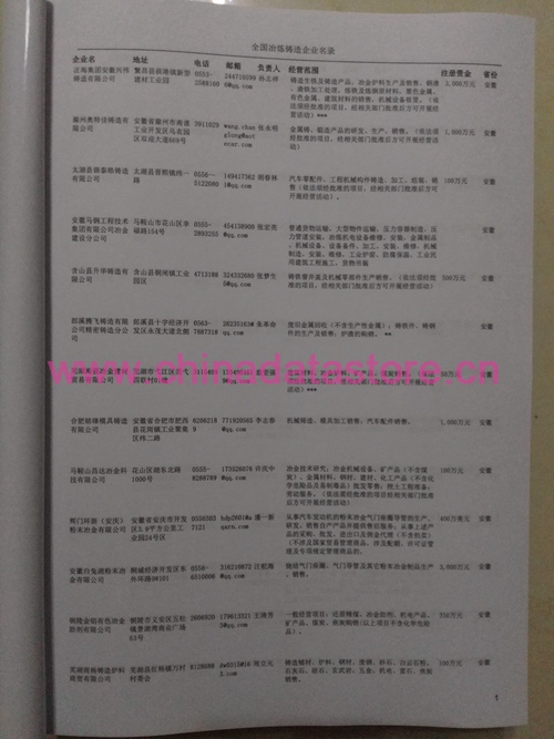 某省或直轄市 | 如上海、浙江冶煉鑄造企業(yè)名單 | 80% - 90% | 600元 | 附贈(zèng)一冊(cè)冶煉鑄造紙質(zhì)印刷品 |