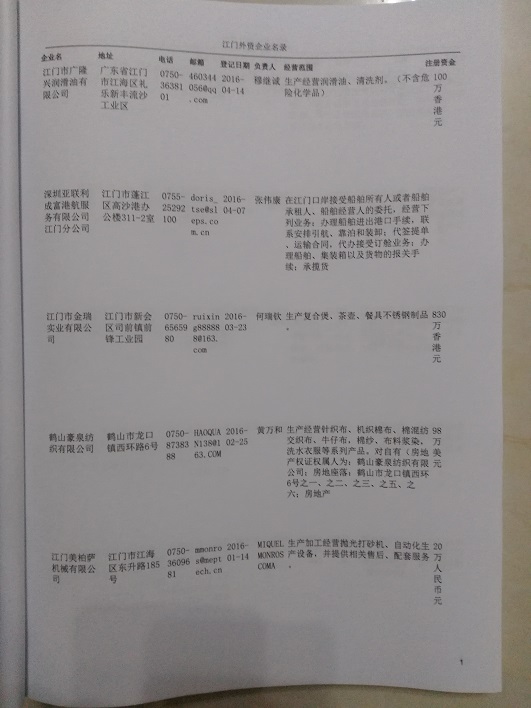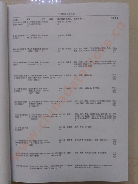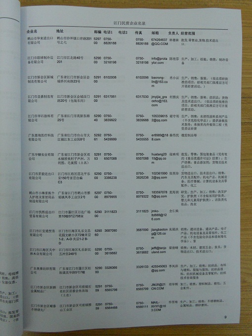 2021版最新江門企業(yè)黃頁包括《江門制造企業(yè)黃頁》、《江門貿(mào)易企業(yè)黃頁》、《江門民營(yíng)企業(yè)黃頁》、《江門外資企業(yè)黃頁》、《江門外貿(mào)企業(yè)黃頁》共五冊(cè),現(xiàn)優(yōu)惠價(jià):280元/冊(cè)。每?jī)?cè)內(nèi)容包括:?jiǎn)挝幻Q、地址、郵編、電話、傳真、郵箱、經(jīng)營(yíng)范圍等;江門企業(yè)黃頁涵蓋了近幾年來最新成立的、有一定規(guī)模的企業(yè),具有非常高的營(yíng)銷價(jià)值。有了這套黃頁開展業(yè)務(wù)也有了針對(duì)性,也省去了盲目去尋找客戶名單而浪費(fèi)的時(shí)間了,工作效率也會(huì)有很大的提高。歡迎需要江門企業(yè)黃頁的朋友及時(shí)聯(lián)系我們!