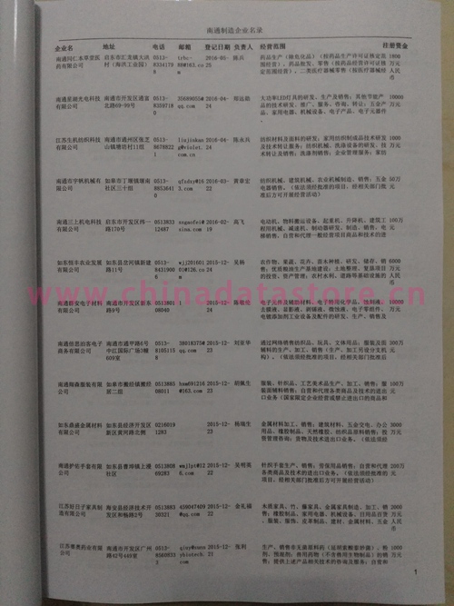 2021版最新南通企業(yè)黃頁(yè)包括《南通制造企業(yè)黃頁(yè)》、《南通貿(mào)易企業(yè)黃頁(yè)》、《南通民營(yíng)企業(yè)黃頁(yè)》、《南通外資企業(yè)黃頁(yè)》、《南通外貿(mào)企業(yè)黃頁(yè)》共五冊(cè),現(xiàn)優(yōu)惠價(jià):280元/冊(cè)。每?jī)?cè)內(nèi)容包括:?jiǎn)挝幻Q(chēng)、地址、郵編、電話(huà)、傳真、郵箱、經(jīng)營(yíng)范圍等;南通企業(yè)黃頁(yè)涵蓋了近幾年來(lái)最新成立的、有一定規(guī)模的企業(yè),具有非常高的營(yíng)銷(xiāo)價(jià)值。有了這套黃頁(yè)開(kāi)展業(yè)務(wù)也有了針對(duì)性,也省去了盲目去尋找客戶(hù)名單而浪費(fèi)的時(shí)間了,工作效率也會(huì)有很大的提高。歡迎需要南通企業(yè)黃頁(yè)的朋友及時(shí)聯(lián)系我們!