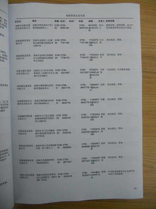 2021版最新珠海企業(yè)黃頁包括《珠海制造企業(yè)黃頁》、《珠海貿易企業(yè)黃頁》、《珠海民營企業(yè)黃頁》、《珠海外資企業(yè)黃頁》、《珠海外貿企業(yè)黃頁》共五冊,現優(yōu)惠價:280元/冊。每冊內容包括:單位名稱、地址、郵編、電話、傳真、郵箱、經營范圍等;珠海企業(yè)黃頁涵蓋了近幾年來最新成立的、有一定規(guī)模的企業(yè),具有非常高的營銷價值。有了這套黃頁開展業(yè)務也有了針對性,也省去了盲目去尋找客戶名單而浪費的時間了,工作效率也會有很大的提高。歡迎需要珠海企業(yè)黃頁的朋友及時聯系我們!