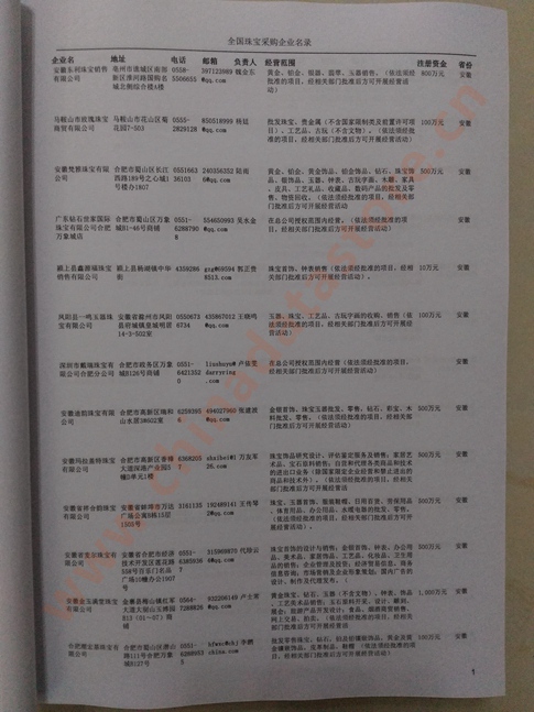 2024年新版中國珠寶采購企業(yè)黃頁,收錄了全國各地經(jīng)營范圍涉及珠寶產(chǎn)品的貿(mào)易企業(yè),這些都是頗具實力的珠寶產(chǎn)品的中國采購商。黃頁內(nèi)容包含:企業(yè)名稱、地址、電話、傳真、郵箱、經(jīng)營范圍、省份、注冊資金等信息。該套黃頁包含一個黃頁光碟加一冊紙質(zhì)書刊,全國價格:1500元,省/直轄市價格:400元,城市價格:200元,共收錄了全國各地大概44763(統(tǒng)計日期:2018.1)家珠寶產(chǎn)品采購企業(yè)。黃頁光碟中是EXCEL格式,信息可任意修改、復(fù)制、打印、導(dǎo)出及導(dǎo)入到傳真、郵件群發(fā)等軟件中,無任何限制。