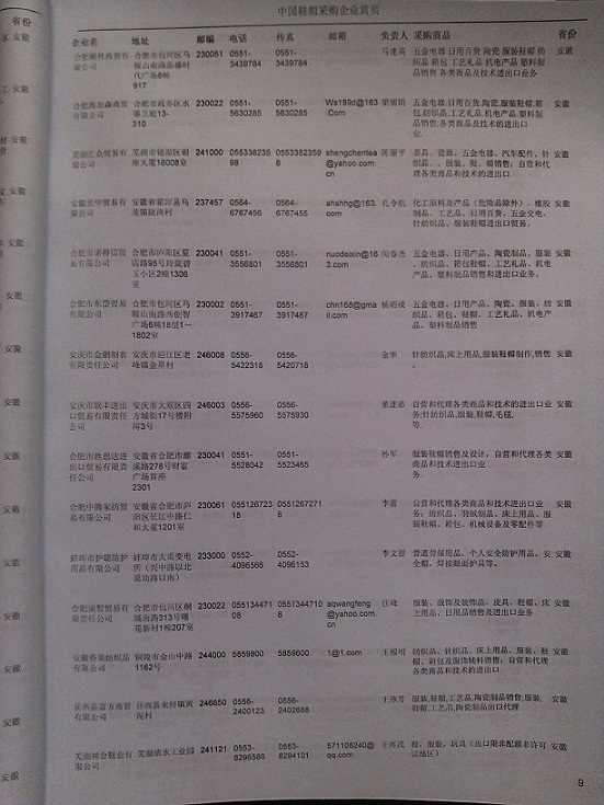 2024年新版中國鞋帽采購企業(yè)黃頁,收錄了全國各地經(jīng)營范圍涉及鞋帽產(chǎn)品的貿(mào)易企業(yè),這些都是頗具實力的鞋帽產(chǎn)品的中國采購商。黃頁內(nèi)容包含:企業(yè)名稱、地址、電話、傳真、郵箱、經(jīng)營范圍、省份、注冊資金等信息。該套黃頁包含一個黃頁光碟加一冊紙質(zhì)書刊,全國價格:1500元,省/直轄市價格:400元,城市價格:200元,共收錄了全國各地大概6060(統(tǒng)計日期:2018.1)家鞋帽產(chǎn)品采購企業(yè)。黃頁光碟中是EXCEL格式,信息可任意修改、復(fù)制、打印、導(dǎo)出及導(dǎo)入到傳真、郵件群發(fā)等軟件中,無任何限制。