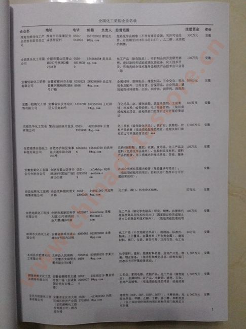 2024年新版中國(guó)化工采購(gòu)企業(yè)黃頁(yè),收錄了全國(guó)各地經(jīng)營(yíng)范圍涉及化工產(chǎn)品的貿(mào)易企業(yè),這些都是頗具實(shí)力的化工產(chǎn)品的中國(guó)采購(gòu)商。黃頁(yè)內(nèi)容包含:企業(yè)名稱(chēng)、地址、電話(huà)、傳真、郵箱、經(jīng)營(yíng)范圍、省份、注冊(cè)資金等信息。該套黃頁(yè)包含一個(gè)黃頁(yè)光碟加一冊(cè)紙質(zhì)書(shū)刊,全國(guó)價(jià)格:1500元,省/直轄市價(jià)格:400元,城市價(jià)格:200元,共收錄了全國(guó)各地大概77995(統(tǒng)計(jì)日期:2018.1)家化工產(chǎn)品采購(gòu)企業(yè)。黃頁(yè)光碟中是EXCEL格式,信息可任意修改、復(fù)制、打印、導(dǎo)出及導(dǎo)入到傳真、郵件群發(fā)等軟件中,無(wú)任何限制。