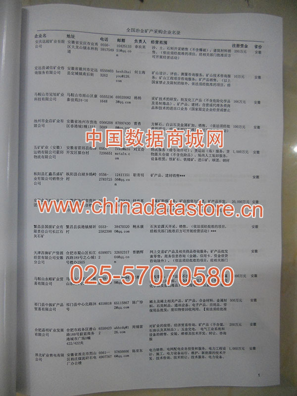 2024年新版中國冶金礦產(chǎn)采購企業(yè)黃頁,收錄了全國各地經(jīng)營范圍涉及冶金礦產(chǎn)產(chǎn)品的貿(mào)易企業(yè),這些都是頗具實力的冶金礦產(chǎn)產(chǎn)品的中國采購商。黃頁內(nèi)容包含:企業(yè)名稱、地址、電話、傳真、郵箱、經(jīng)營范圍、省份、注冊資金等信息。該套黃頁包含一個黃頁光碟加一冊紙質(zhì)書刊,全國價格:1500元,省/直轄市價格:400元,城市價格:200元,共收錄了全國各地大概8042(統(tǒng)計日期:2018.1)家冶金礦產(chǎn)產(chǎn)品采購企業(yè)。黃頁光碟中是EXCEL格式,信息可任意修改、復制、打印、導出及導入到傳真、郵件群發(fā)等軟件中,無任何限制。