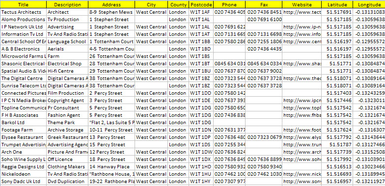 包含字段有:公司名稱,地址,城市地區(qū),郵編,SIC代碼,手機(jī),部分企業(yè)還有網(wǎng)站及傳真。