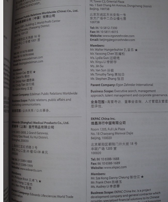 《2016年中國美國商會會員黃頁》為中英文對照形式,收錄了中國美國商會企業(yè)及個人會員黃頁內(nèi)容包括名稱、地址、郵編、電話、傳真、網(wǎng)址、中國聯(lián)系人、負責人、業(yè)務范圍等詳細內(nèi)容