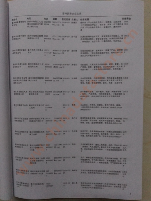 2021版最新泰州企業(yè)黃頁(yè)包括《泰州制造企業(yè)黃頁(yè)》、《泰州民營(yíng)企業(yè)黃頁(yè)》,現(xiàn)優(yōu)惠價(jià):280元/冊(cè)。每?jī)?cè)內(nèi)容包括:?jiǎn)挝幻Q、地址、郵編、電話、傳真、郵箱、經(jīng)營(yíng)范圍等;泰州企業(yè)黃頁(yè)涵蓋了近幾年來最新成立的、有一定規(guī)模的企業(yè),具有非常高的營(yíng)銷價(jià)值。有了這套黃頁(yè)開展業(yè)務(wù)也有了針對(duì)性,也省去了盲目去尋找客戶名單而浪費(fèi)的時(shí)間了,工作效率也會(huì)有很大的提高。歡迎需要泰州企業(yè)黃頁(yè)的朋友及時(shí)聯(lián)系我們!