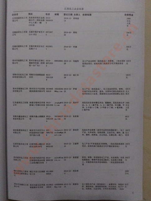 江蘇化工企業(yè)黃頁(yè) | 所有江蘇化工企業(yè)黃頁(yè) | 80% - 90% | 600元 | 附贈(zèng)一冊(cè)江蘇化工紙質(zhì)印刷品 |
