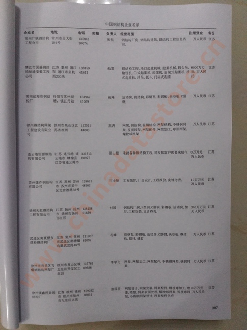 最新鋼結(jié)構(gòu)生產(chǎn)與貿(mào)易企業(yè)黃頁數(shù)據(jù)更新日期2024年12月最新,全國鋼結(jié)構(gòu)企業(yè)名單共12000條,都是具有一定規(guī)模的鋼結(jié)構(gòu)行業(yè)的注冊實體企業(yè),數(shù)據(jù)準確率高,是您開展各項營銷活動的必備資料。鋼結(jié)構(gòu)企業(yè)黃頁包括:企業(yè)名稱、地址、電話、傳真、郵箱、登記日期、經(jīng)營范圍、注冊資金等信息。鋼結(jié)構(gòu)企業(yè)名單數(shù)據(jù)為Excel格式,信息可任意修改、復制、打印、導出及導入到傳真、郵件群發(fā)等鋼結(jié)構(gòu)中,無任何限制。