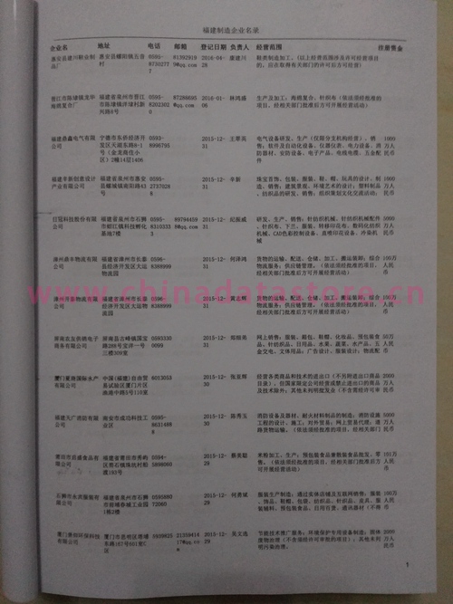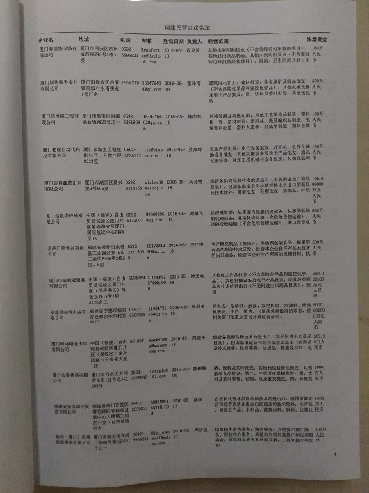 2021版最新福建企業(yè)黃頁包括《福建制造企業(yè)黃頁》、《福建貿(mào)易企業(yè)黃頁》、《福建民營企業(yè)黃頁》共三冊,優(yōu)惠價(jià):280元/冊。每冊內(nèi)容包括:單位名稱、地址、郵編、電話、傳真、郵箱、經(jīng)營范圍等;福建企業(yè)黃頁涵蓋了近幾年來最新成立的、有一定規(guī)模的企業(yè),具有非常高的營銷價(jià)值。有了這套黃頁開展業(yè)務(wù)也有了針對性,也省去了盲目去尋找客戶名單而浪費(fèi)的時(shí)間了,工作效率也會(huì)有很大的提高。歡迎需要福建企業(yè)黃頁的朋友及時(shí)聯(lián)系我們!