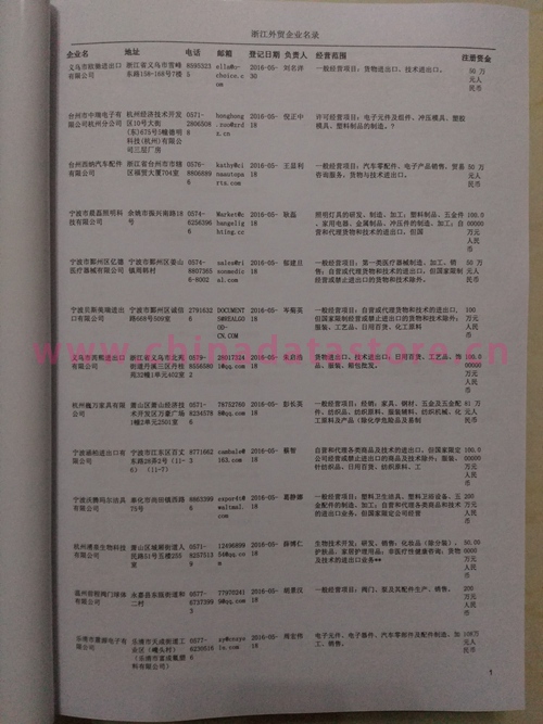 浙江外貿(mào)企業(yè)黃頁包括:外貿(mào)企業(yè)名稱、地址、電話、傳真、郵箱、經(jīng)營范圍、注冊資金等信息。