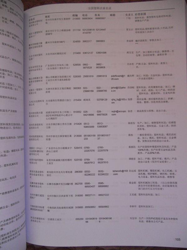 塑料制品外貿(mào)企業(yè)黃頁包括:外貿(mào)企業(yè)名稱、地址、電話、傳真、郵箱、經(jīng)營范圍、注冊(cè)資金等信息。