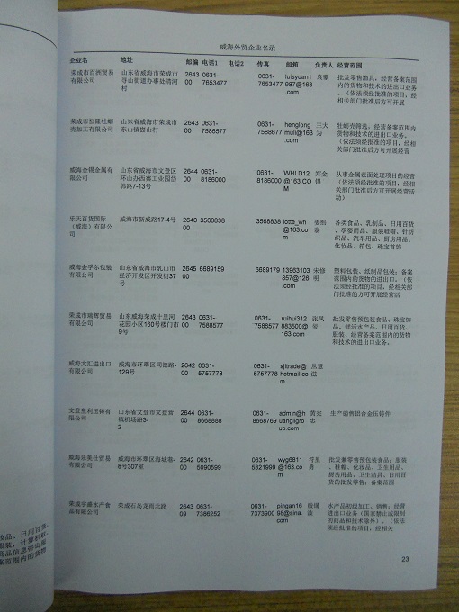 威海外貿(mào)企業(yè)黃頁包括:外貿(mào)企業(yè)名稱、地址、電話、傳真、郵箱、經(jīng)營范圍、注冊資金等信息。