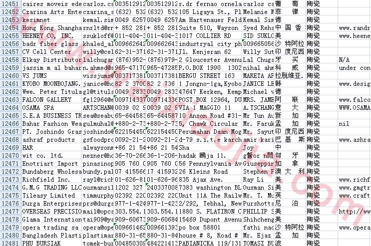 陶瓷采購商名單數(shù)據(jù)為Excel格式,信息可任意修改、復(fù)制、打印、導(dǎo)出及導(dǎo)入到傳真、郵件群發(fā)等軟件中,無任何限制。