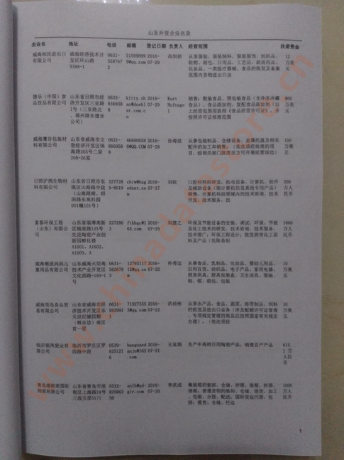 最新山東外資企業(yè)黃頁涵蓋了山東外商獨資企業(yè)、中外合資經營企業(yè)以及港、澳、臺資企業(yè),包括山東臺資日資企業(yè)黃頁,山東外企黃頁具體內容包括:企業(yè)名稱、地址、電話、傳真、郵箱、經營范圍、注冊資金等信息;山東外資企業(yè)黃頁里面的企業(yè)都一些中外合資的大企業(yè),這些公司經濟實力都比較雄厚,出口產品也比較多,業(yè)務范圍都比較廣,跟他們開展業(yè)務往來都比較容易;有了山東日企臺企黃頁開展業(yè)務也有了針對性,也省去了盲目去尋找客戶名單而浪費的時間了,工作效率也會有很大的提高.歡迎需要的客戶及時聯(lián)系我們!
